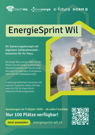 Die Stadt Wil und die TBW mit ihrer Marke DeineEnergie lancieren mit Energiesprint Wil eine umfassende Beratungskampagne für Besitzerinnen und Besitzer von Einfamilienhäusern. Auf der Grundlage des Projektvorschlags von e-futura bieten die kostenlosen, unabhängigen und persönlichen Energieberatungen – inklusive digitalem Energieausweis – einen klaren Überblick darüber, welche Sanierungsschritte sich für das eigene Zuhause lohnen und weshalb. Das Angebot läuft bis zum 30. April 2026, und Anmeldungen sind ab sofort möglich.